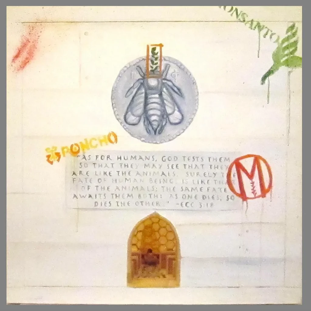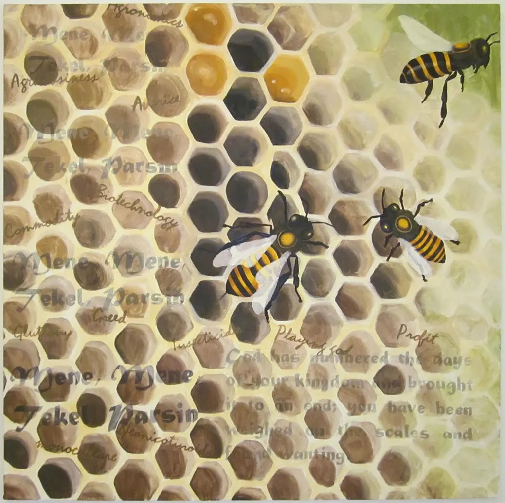 “The Writing on the Wall” includes text from the Book of Daniel: “Mene, Mene, Tekel, Parsin: God has numbered the days of your kingdom and brought it to an end; you have been weighted on the scales and found wanting” and words like “agribusiness, playing god, pesticides, monoculture, greed…” written on the wall behind the honeycomb. Nearly all of the cells of the comb are empty, and only a few bees remain. The term “the writing is on the wall” has come to mean the foreshadowing of doom and destruction. The honeybees disappearing from CCD are the writing on the wall: honeybees are not the only or even the most important pollinators of our food chain. They are however, the only pollinator that has been domesticated and can be easily tracked and most importantly, have their own industry and economic impact. We didn’t notice CCD because crops are failing, it was because the beekeepers who transport large hives along a cross-country circuit noticed that their bees were leaving the hive and never coming back, and their hives were dying. The leading research implicates a class of pesticides called neonicotinoids that interfere with the bees’ ability to communicate with each other, leading to hive abandonment and starvation. Even when the pesticide is applied in doses that are not immediately lethal to bees in the environment, it interferes with their ability to pass information on the location of food to their colony, and appear to weaken their immunity to a virus that makes them more susceptible to varroa mites that feed on baby bees while they develop. No one knows what these chemicals do to other pollinators such as butterflies, moths, wasps, or ground bee. If we do not listen to the writing on the wall and continue towards pollinator extinction our food source is doomed.