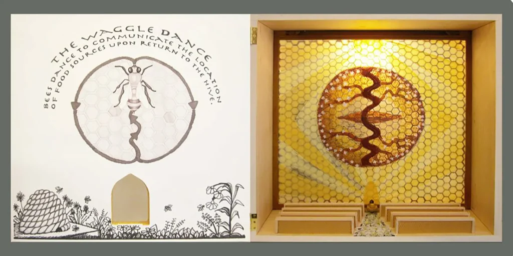 “The Desecration of the Hive” is an interactive piece with more to be discovered inside. A combination beehive and church, the text comes from the Book of Ecclesiastes “As for humans, God tests them so that they may see that they are like the animals. Surely the fate of human beings is like that of the animals: the same fate awaits them both – as one dies, so dies the other” Ecc 3:18. The graffiti symbols on the outside are brands of pesticides that produce Neonicotinoids and are fighting desperately to prevent the ban of their use: despite the fact that bans of neonicotinoids in parts of Europe have resulted in rebounding bee populations in areas hard hit by CCD. Inside the box are pews made of honeycomb, and a large stained glass wall depicting the tree of life shaped to mimic the pattern of the waggle dance the bees use to communicate, and a drawing of the dance. On the alter at the front of the church is an offering of pollen.