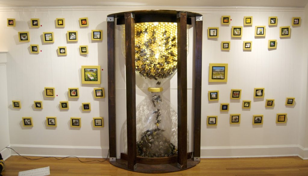 In May of 2012 I came across a listing for art submissions for a show called “Plight of the Pollinators.” I began reading about the disappearance of honeybees and the mysterious phenomenon of Colony Collapse Disorder (CCD). With a little research I found out that since 2006 around 30% of honeybee colonies are dying each year in the United States, with losses greater than that in some areas. I found no clear answer as to the cause of the collapse, but the bees had captured my attention. I produced “Vaya con Dios and Daisies” in response to the call for art, but was unable to let the bees go and they became the focus of my art for the next two years. In April, 2013 I launched a Kickstarter campaign to raise funds to have time to produce my first solo show and to raise awareness and involve my community in the production of what became The Hive Project.